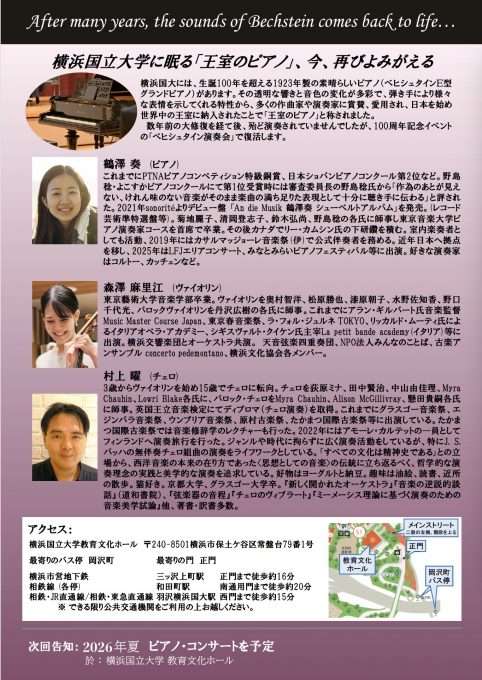 次回のベヒシュタイン演奏会は、2026年4月5日(日)のピアノ、ヴァイオリン、